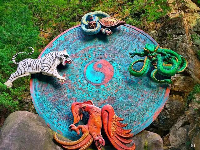 走完了二十八盘步道,路口有“莲花山”的牌坊,乘坐景区观光车最远就是到这里,路旁的巨石上有青龙、白虎、朱雀、玄武的塑像,刻满了二十八星宿相关的图文字符,我天朝文化博大精深,要是弄懂了这个,那就不是装逼了,是真逼呀~