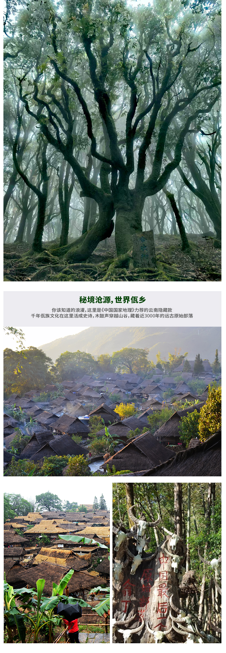早餐后乘车前往【金山原始森林】,自由漫步在原始森林中,这里完全就像电影里的绿野仙踪,树上路上都长满了青苔和各类植物,负氧离子含量极高。体验哀牢山原始森林徒步结束后我们前往沧源,途经双江拉祜族佤族布朗族傣族自治县,午餐可以在这个中国名字最长的县城享用。午餐抵达沧源【葫芦小镇】参观,这里是商业与当地文化结合的步行街。傍晚我们可以结伴体验到佤族特色美食【佤王宴】,感受云南美食的野性之美。当晚我们入住沧源县城酒店。
