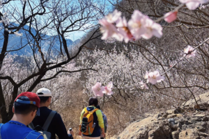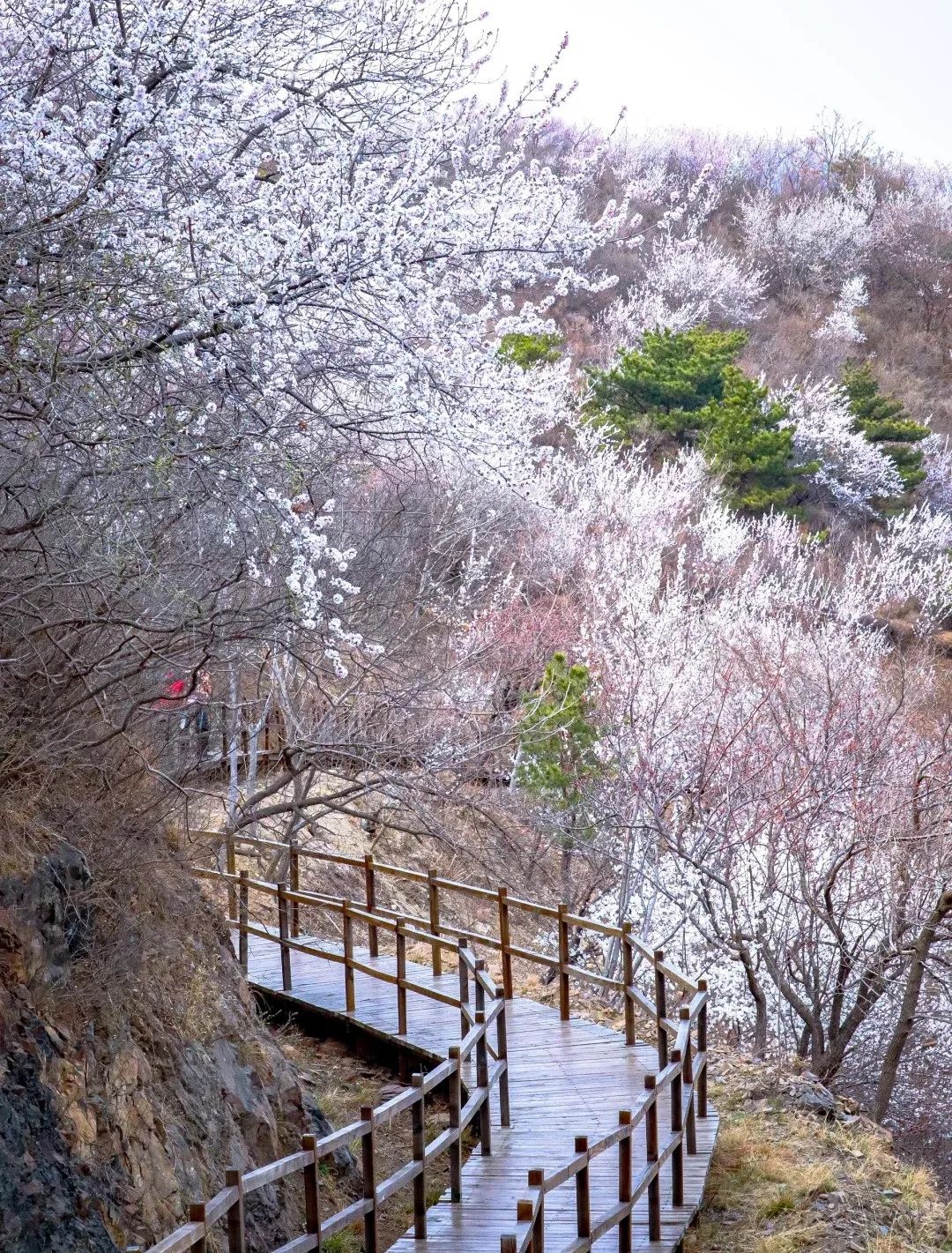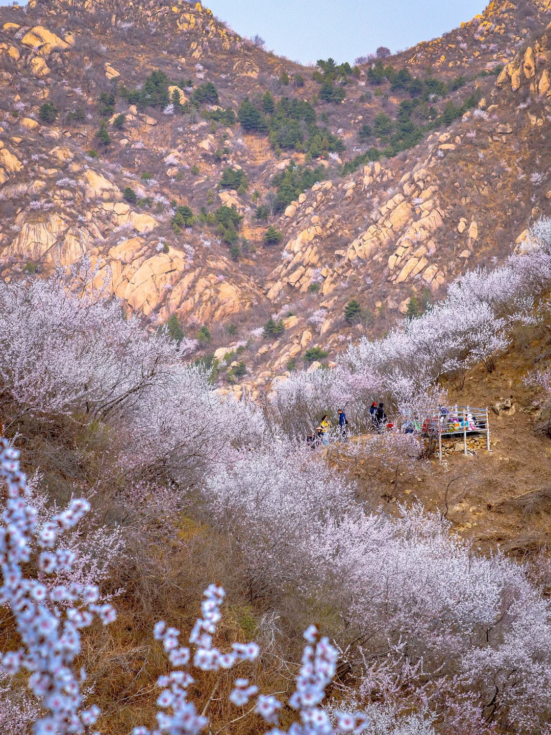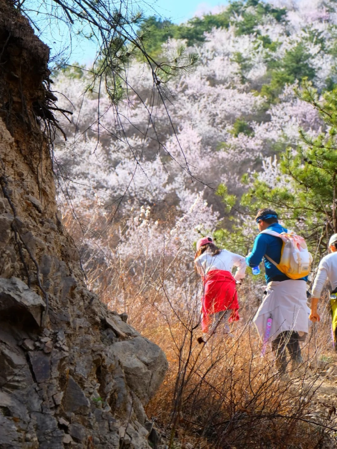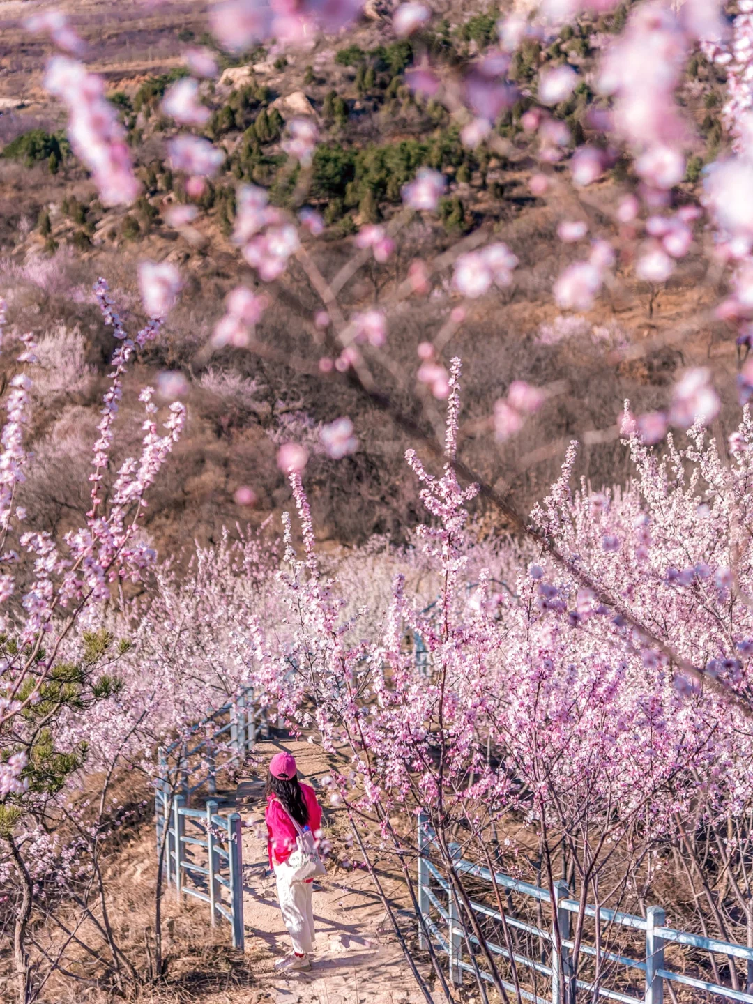 望宝川至东水峪环线,是一条贯穿燕山腹地原始峡谷的十公里徒步路线。线路以北京市昌平区望宝川村为起点,途经明代古长城遗迹、野生桃花谷、丹霞地貌区,最终抵达东水峪古村落遗址并折返,形成一条海拔攀升约四百米的环线。抵达首个观景台,可俯瞰山谷初现的粉色花海。路径沿溪涧蜿蜒,两侧丹霞地貌赤壁耸立,与野生桃林形成强烈色彩对比。春季两侧山桃、山杏夹道,三月初至四月初为最佳花期。