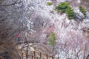 望宝川村是一个美丽的盆地村,海拔380-450米,四周群山环绕,山体土壤呈酸性,适合核桃、栗树生长。而春天,这里更是桃花的海洋!桃花灼灼,盛开在山坡上,如同粉色的云朵,美得让人窒息。最佳赏花时间是3月末4月初,此时桃花盛开,正是拍照的好时机。