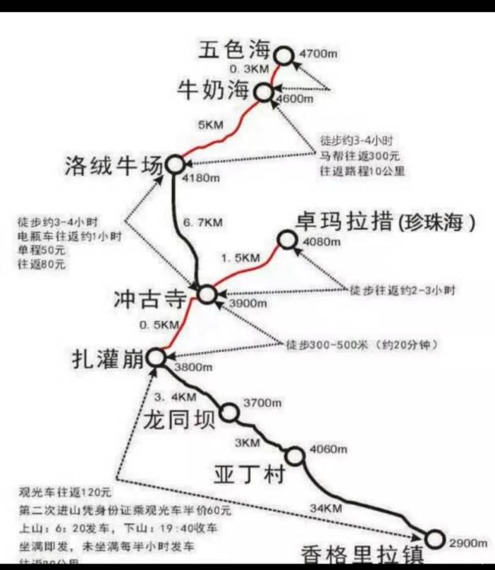 Ps:珍 珠海 海拔4100米,牛奶海海拔4600米,五色海海拔4800米,大家一定要根据自身身体状况选择合适的线路和景点游览。