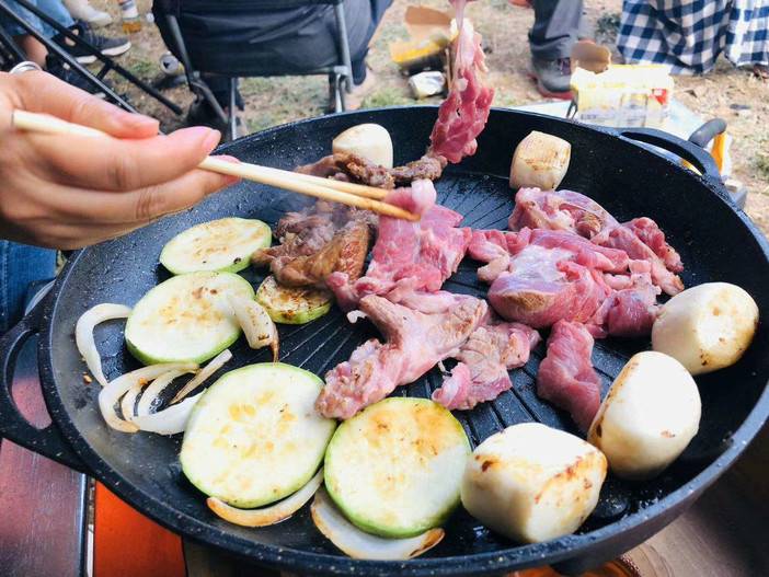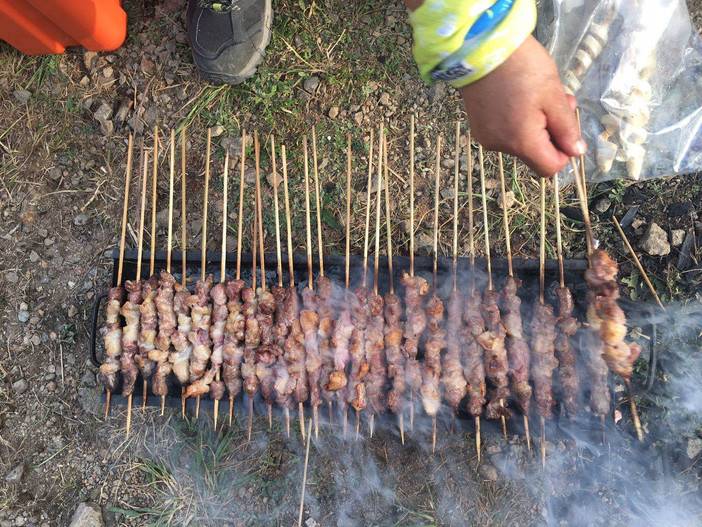 到达营地后,发现有辆小伙伴的车没跟上,燃鹅营地没有一丢丢信号,于是开始漫山遍野找信号,给后面掉队的车发定位,人齐以后开始分发装备,扎营收拾营地,营地没有任何信号,也开始了我们两天的远离尘世的“隐居”森活,溜达一圈,五点多了,生火点碳,准备烧烤,哈哈^_^又到了喜闻乐见的撒毒时刻