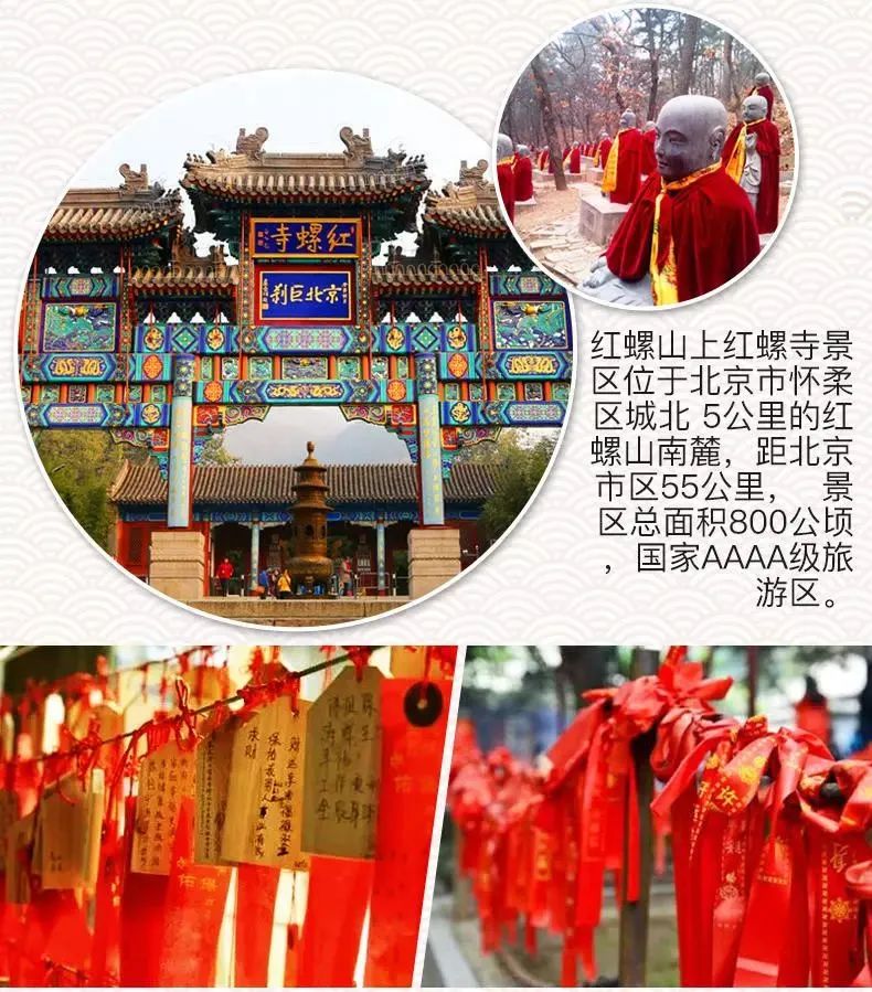 红螺寺是驰名中外的佛教名山古刹,有着1600多年的悠久历史和深厚的佛教文化底蕴,它的开山缘起,可以追溯到中国佛教初兴的东晋时代,是中国北方佛教的发祥地和佛教丛林。红螺山海拔813米,已建成四条特色登山线路万余米,为游客登山祈福提供好去处。人们可以在磨练意志、增强体魄的同时,享受到回归自然的喜悦。