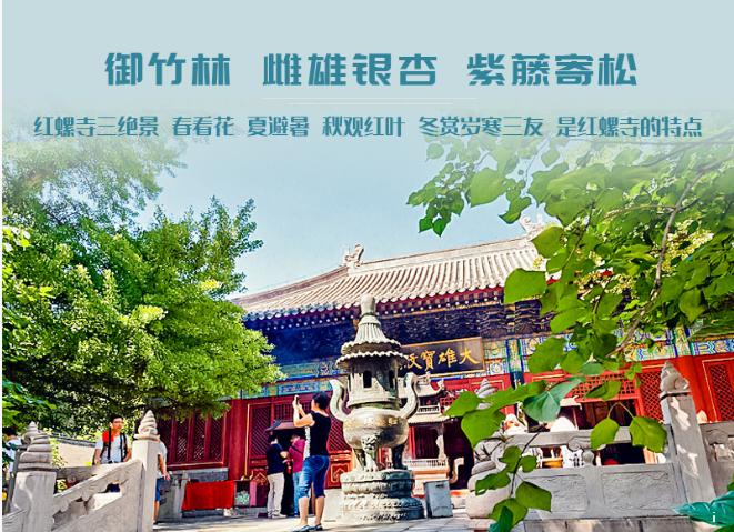 红螺寺景区现已形成了构成了“春看花、夏避暑、秋观叶、冬赏岁寒三友”的观光特色。在这里既可以走进古刹,瞻仰庄严佛仪,焚香顶礼,参悟自身心性,祛除诸多烦恼获得平静的愉悦,也可以漫步林间小憩松下或登高望远临风高歌,尽情领略感悟休闲的乐趣。