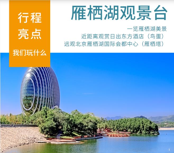 【活动时间】:周六日 *注:法定节假日假期行程取消雁栖湖观景台。