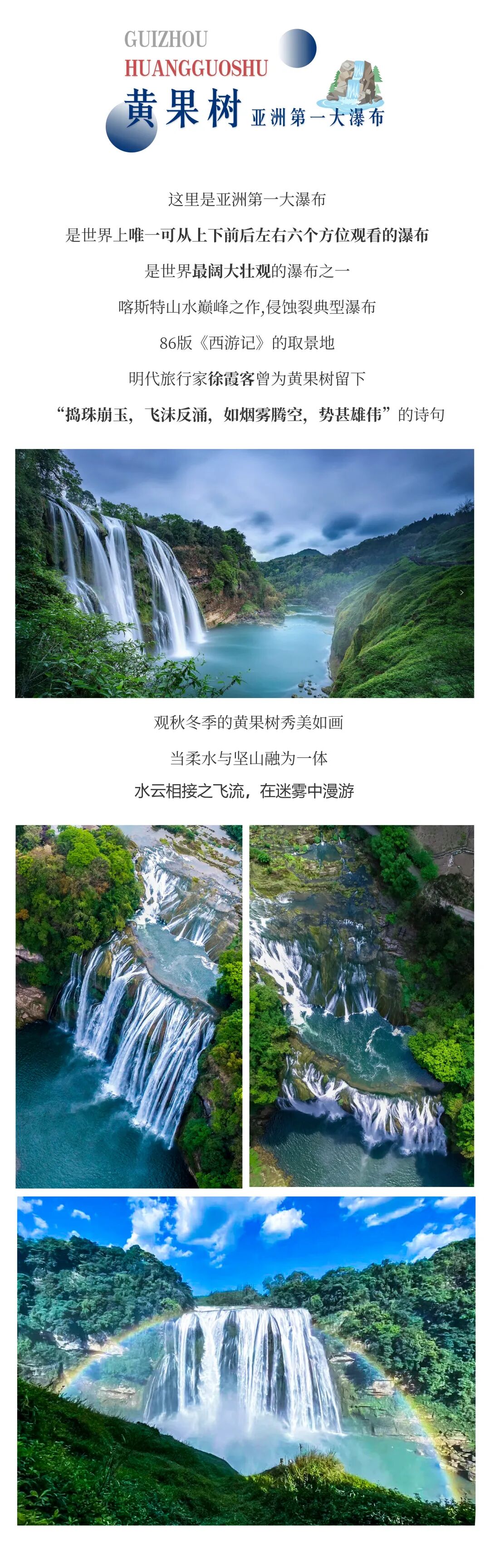 早餐后,我们出发前往游玩完83版西游记片尾曲会出现的镜头——黄果树景区最宽的【陡坡塘瀑布】。之后前往【大瀑布景区】,作为贵州的最大经典招牌,他的壮观之景毋庸置疑。游览有亚洲第一大瀑布之称的【黄果树大瀑布】,感受飞流直下三千尺,疑似银河落九天之气魄;以黄果树大瀑布(高77.8米,宽101米)为中心,分布着雄、奇、险、秀风格各异的大小18个瀑布,形成一个庞大的瀑布“家族”,被大世界基尼斯总部评为世界上最大的瀑布群,列入世界基尼斯记录。如果有时间之余,可以再去【天星桥景区】,上半段游玩1小时左右,下半段游玩3小时左右,我们在【天星洞】【银链坠潭瀑布】、【水上石林】等景点漫步其中,到处可见泉水喷涌、飞瀑倾泻、有水皆成瀑,石盘根成为天星桥的真实写照。