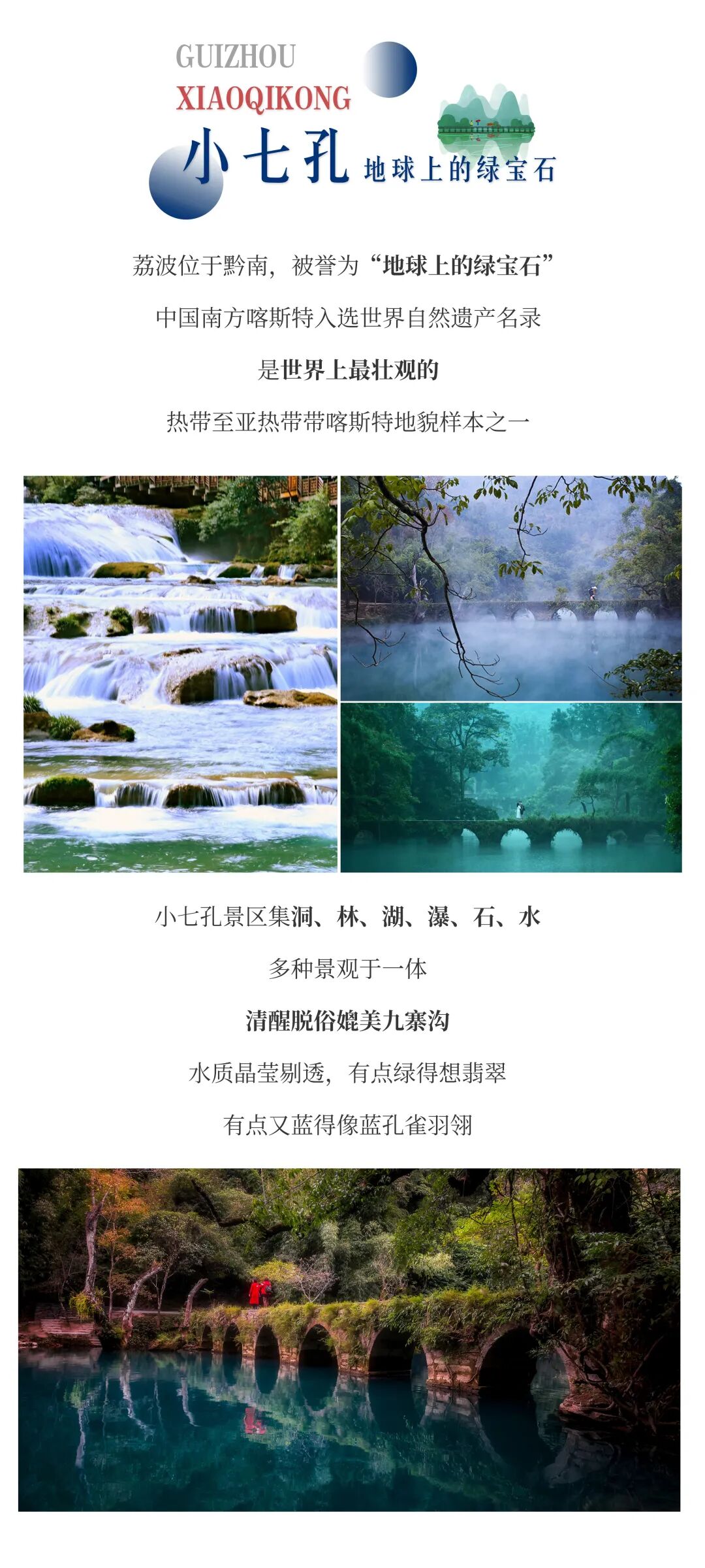 早餐后,我们出发前往【荔波小七孔】,荔波位于贵州与广西的交界处,小七孔更是被称为地球上的绿宝石,我们从西门进入小七孔景区,穿过清朝时期修建的小七孔桥,步行于这“抬头张家界,低头九寨沟”的自然风光,步行于走道上,水花溅落在四周,感受(68级跌水瀑布】和【拉雅瀑布】的壮观,我们戏水踏步于“水上有石,石上有树,树植水中”的【水上森林】,归隐于卧龙潭瀑布。在天然的喀斯特高原湖上,尽情的用充足的时间深度这里的山水美景。结束后乘车去荔波县入住,约半小时抵达荔波县。大家会感受荔波美食街的热闹景象,好好的满足一顿晚餐的欢乐时光。