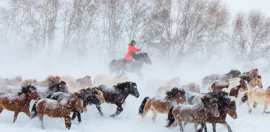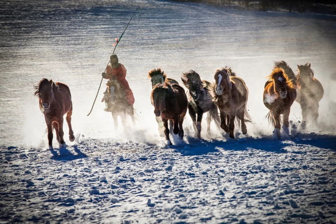 - 『马踏飞雪』前往拍摄雪地狂奔的马群(费用自理),马倌会根据大家的拍摄角度让追赶着马儿奔跑在辽阔的大草原之上。冬季拍摄雪地奔马场面远远好于夏秋季节奔马的场面,逆光和侧逆光拍摄马匹在雪地奔跑,鬃毛、马尾、溅雪、哈气的画面层次动感强烈,气势磅礴。草原最少不了的就是牛羊成群,马儿奔腾,在远处看着马群在皑皑白雪上奔跑,鬃毛、马尾、溅雪、哈气的画面气势磅礴,比夏季在草原看万马奔腾带来的视觉冲击更加强烈。