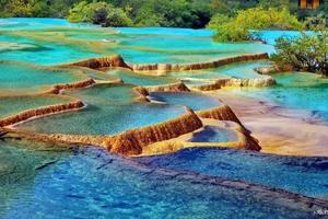 五彩池是位于黄龙最上端的钙化彩池群,无数块大小不等,形状各异的彩池共有693个。之所以颜色不同,是因为每一块钙化池内水的颜色因为地质钙化程度不同的原因而呈现出不同的色彩,蓝绿、海蓝、共有浅蓝等等,艳丽奇绝。