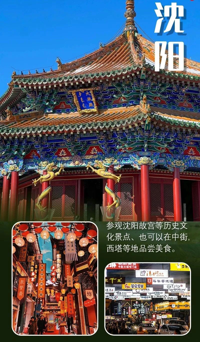- 早上可以早起游览沈阳市内景点,如小河沿早市、太清宫、沈阳故宫、沈阳中街等;不想起的酒店继续睡到自然醒。