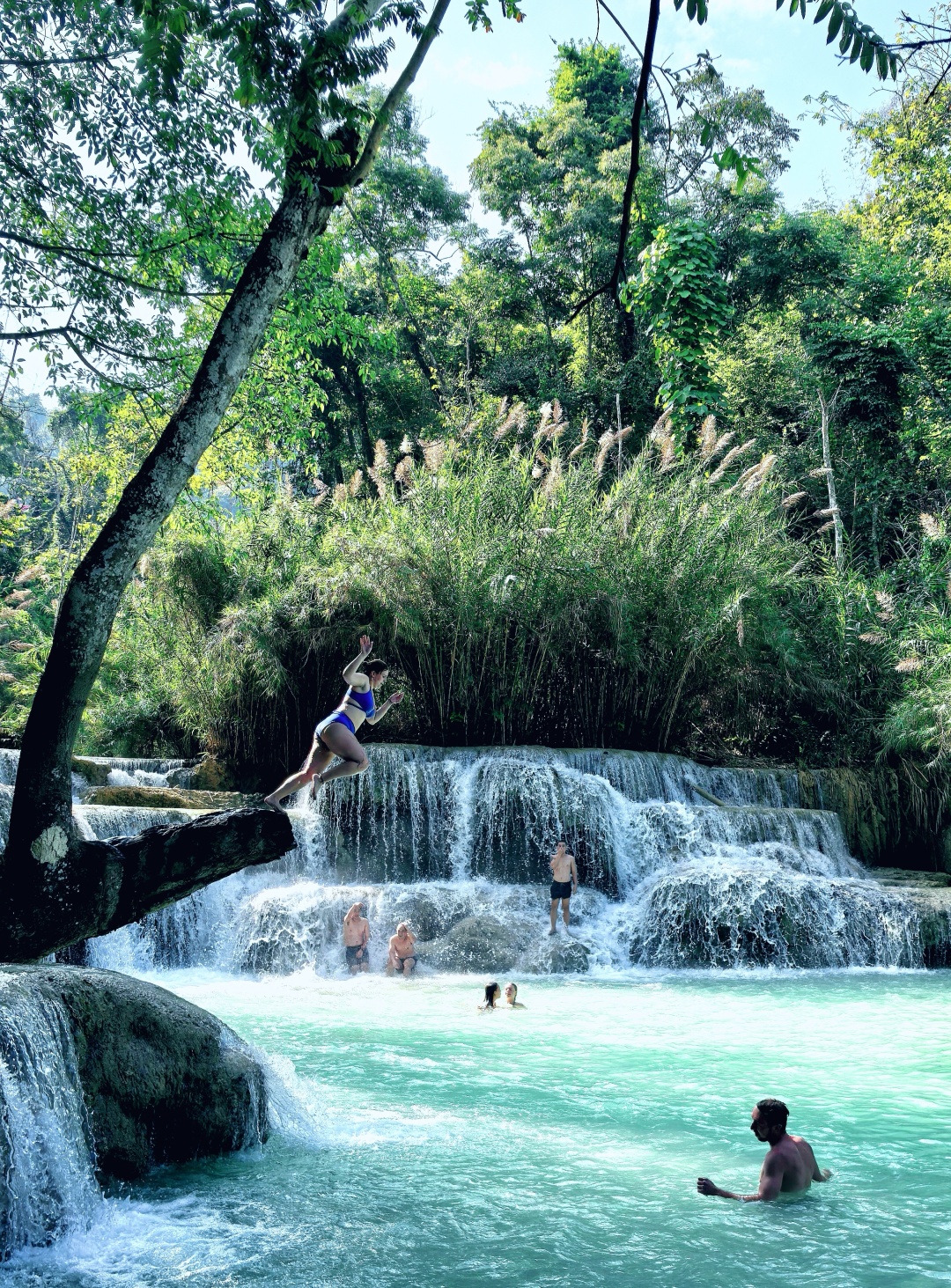午餐后前往久负盛名的【光西瀑布】,有老挝“棉花堡”之称,光西瀑布因其喀斯特地貌的原因,使得山泉水如海水一样湛蓝,其中有一处高约 200 多米的瀑布直泻而下,相当壮观。站在瀑布前,清凉的水珠扑面而来,仿佛心灵也受到了荡涤。喜欢玩水的朋友,一定要带上游泳衣或比基尼,在这里和外国友人一起感受世外桃源,体验跳水及森林泳池乐趣。