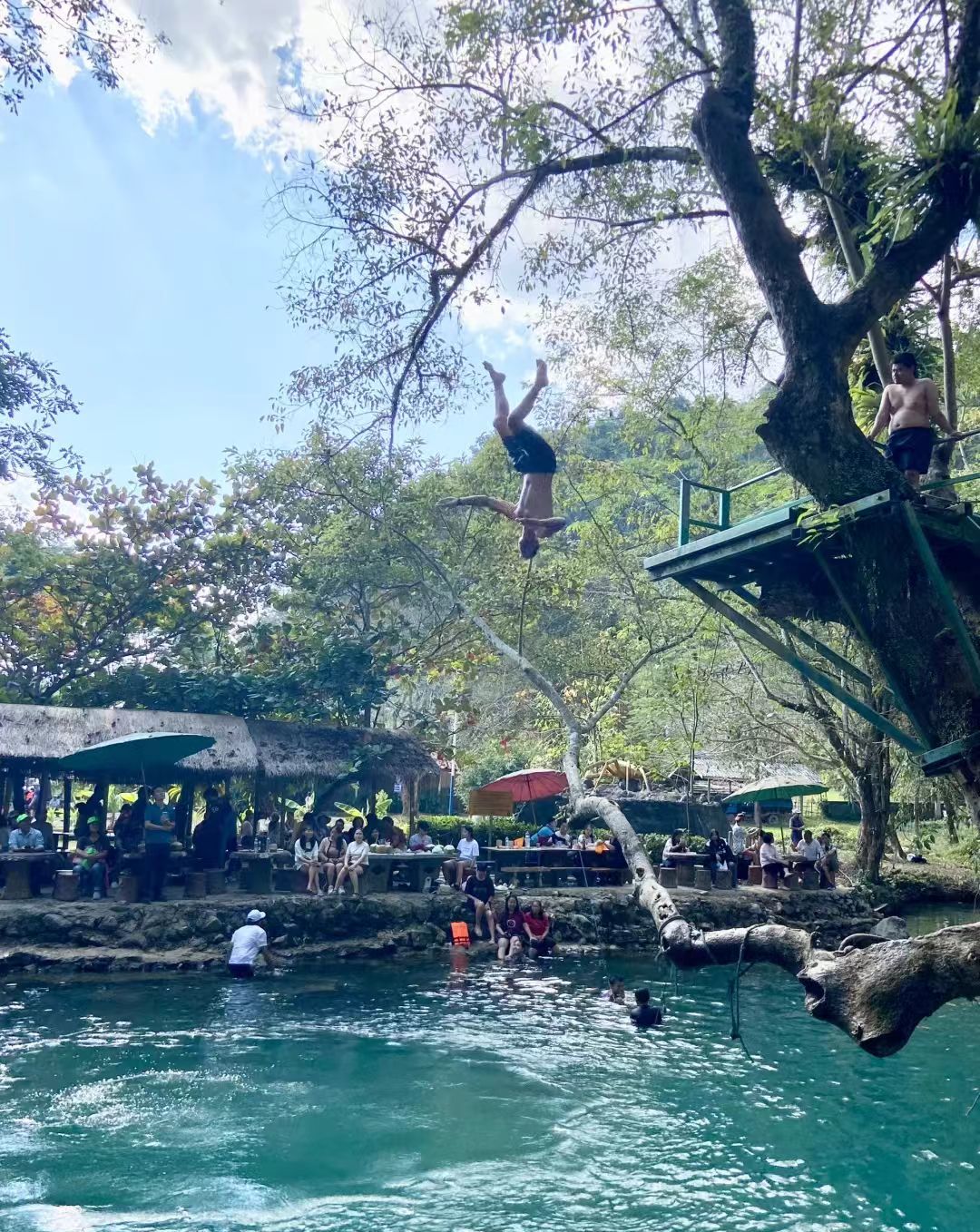 随后返回酒店收拾行礼,从琅勃拉邦站乘坐动车(二等坐)前往老挝户外天堂【万荣】,车程1小时后抵达万荣酒店办理入住。稍作休息后前往万荣【蓝色泻湖】,是游客必须打卡的地方,水质非常好,里面有许多鱼儿游弋。泻湖实在耀眼,世界各地游客争相到此,游客站在5米高树枝跳台上往下跳,是到这里游玩的主要项目,跳入蓝色的湖水中享受清凉,更可仰望帅哥穿越高空滑索;蓝色泻湖往上步行一百米便是【普坎溶洞】,是万荣负盛名的岩洞,巨大的溶洞神秘而又原生态;主洞里供奉着一尊青铜卧佛,在阳光照射在主洞室内呈现出丁达尔效应,备受外国游客的青睐。