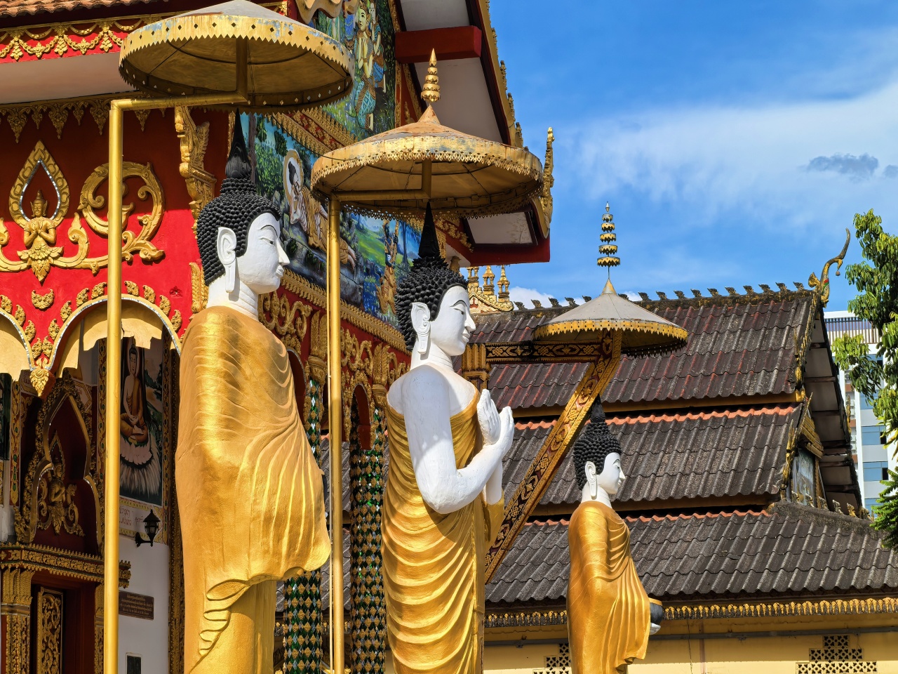 早餐后出发游览【香通寺】,它是琅勃拉邦维一的皇家寺院,揭示因果轮回的“生命之树”、卧佛、老方丈为镇寺三宝。 据说在寺院建造前,这里就有一棵参天巨树,后来在大殿的后墙上画上了这幅“生命之树”,上面的图案都是一个一个佛教中因果轮回的传说故事。