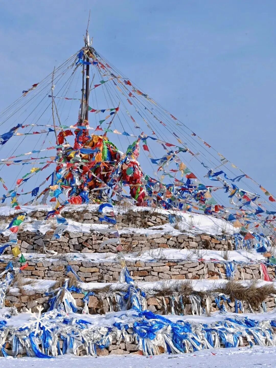 祈福吉祥平安25万块石头搭起的敖包,在白雪的覆盖下神圣且庄严,按照当地的习俗转教包,为自己和家人祈福吉祥平安。
