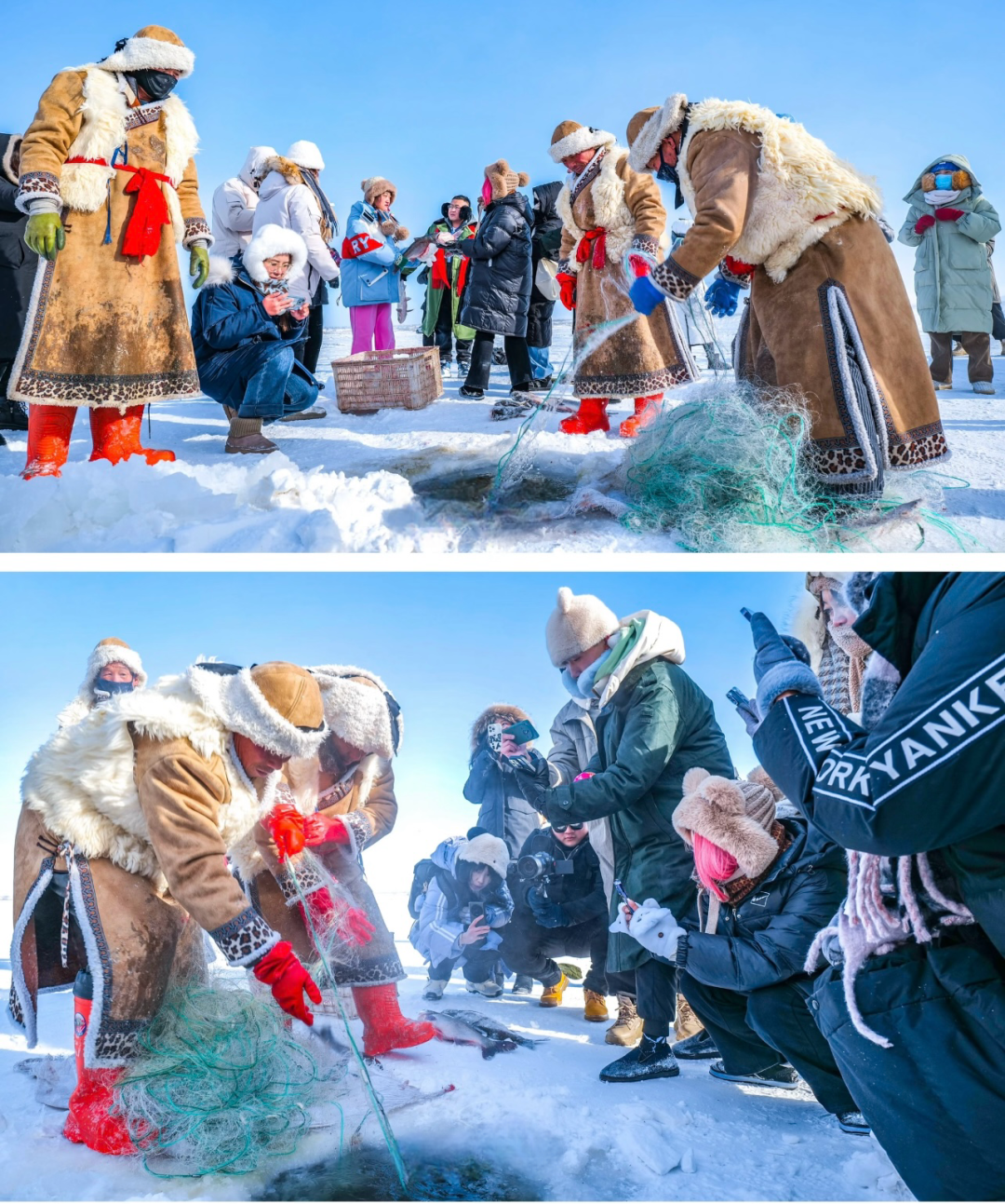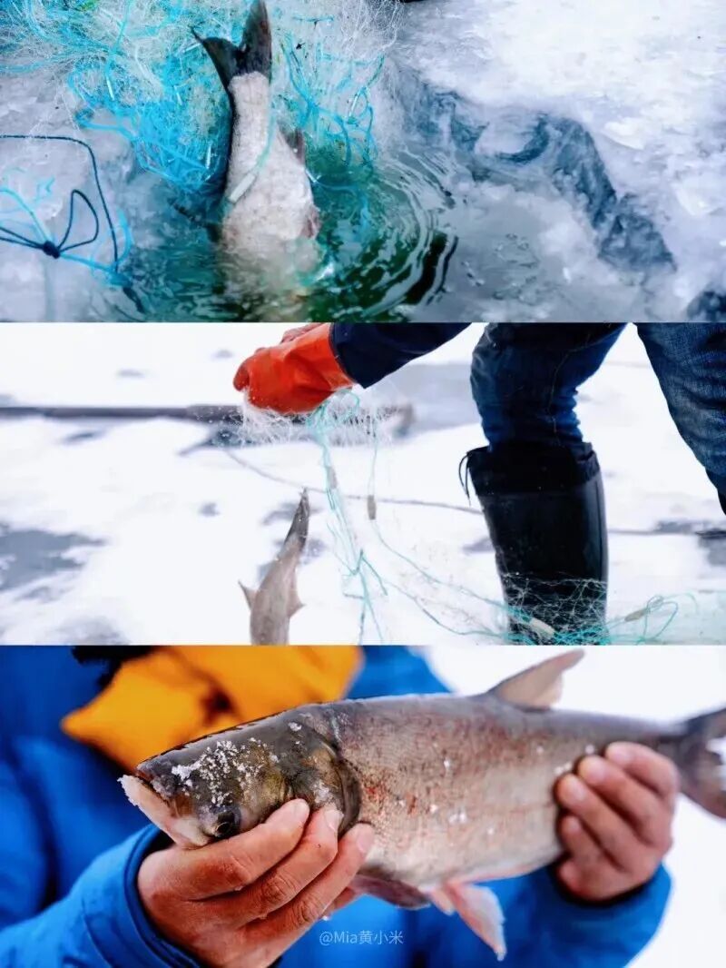 看那渔网缓缓拉起银鳞闪烁,鱼儿跳跃,是大自然最真挚的馈赠,和朋友一起感受这份收获的喜悦,讲述古老的渔猎故事。鲜活的大鱼被捕上冰面的瞬间就被寒冷的空气定格。这一刻冰封的冬季仿佛也被这份收获的喜悦所融化。