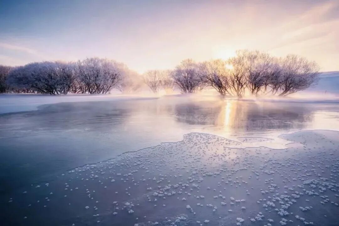 「 魔界日出 」绝美日出,早上太阳刚出来的时候可以看到河面上烟雾缭绕,晨雾下颇有酷似魔界之感,简直就是冰雪的童话世界,大自然鬼斧神工雕刻下的草原多姿多彩,如诗如画。
