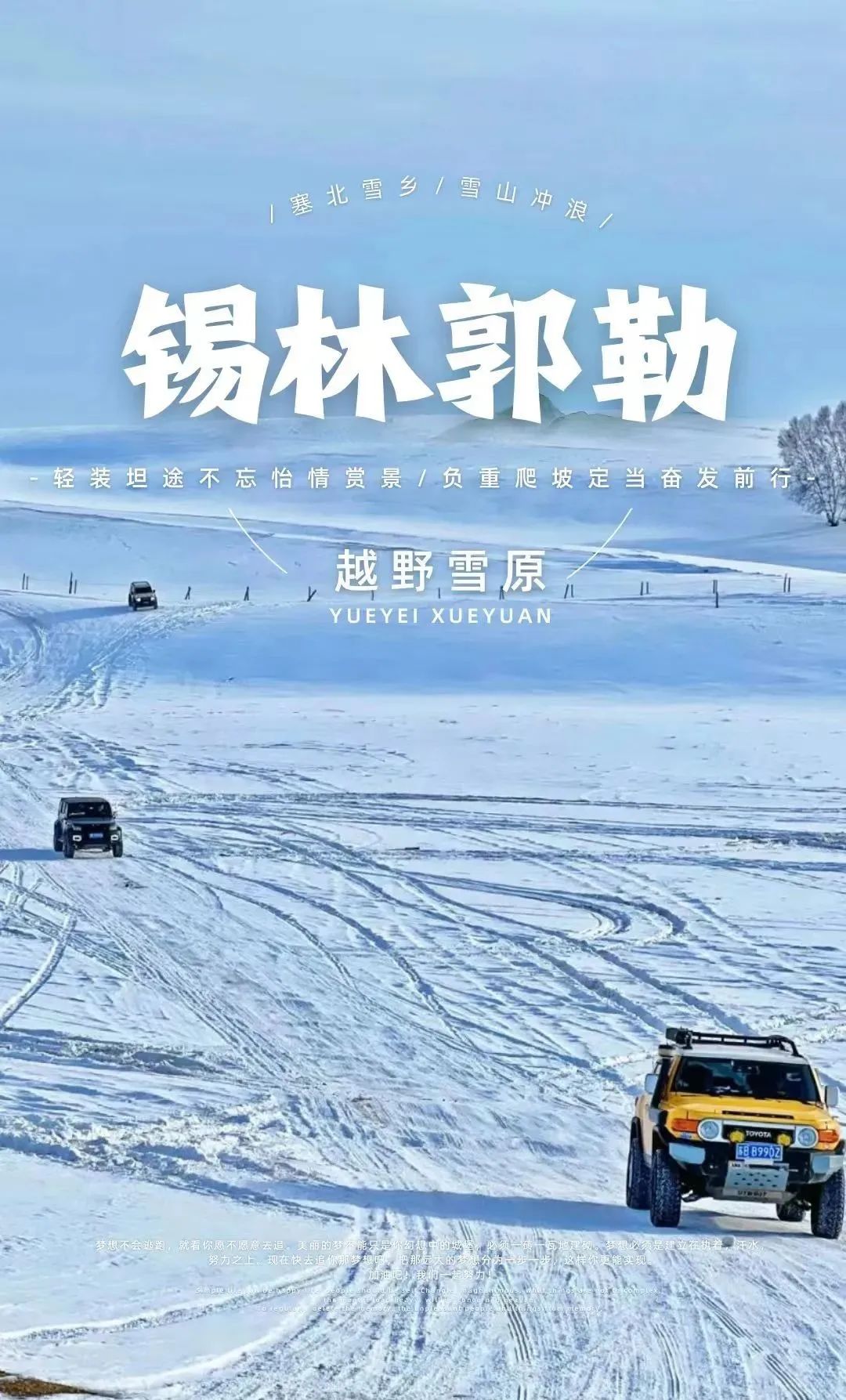 霸气的越野车,在无边的雪域中驰骋,穿越林海雪原,挑战极限路况。每一次颠簸都是心跳的加速,让人感受那份来自大自然的狂野与自由,激发探索未知的勇气与梦想!乘坐越野车前往谷歌地图上挖到的宝藏秘境,穿越真正的林海雪原,这一段路途拥有坝上地区醉美的自然雪景一次看尽