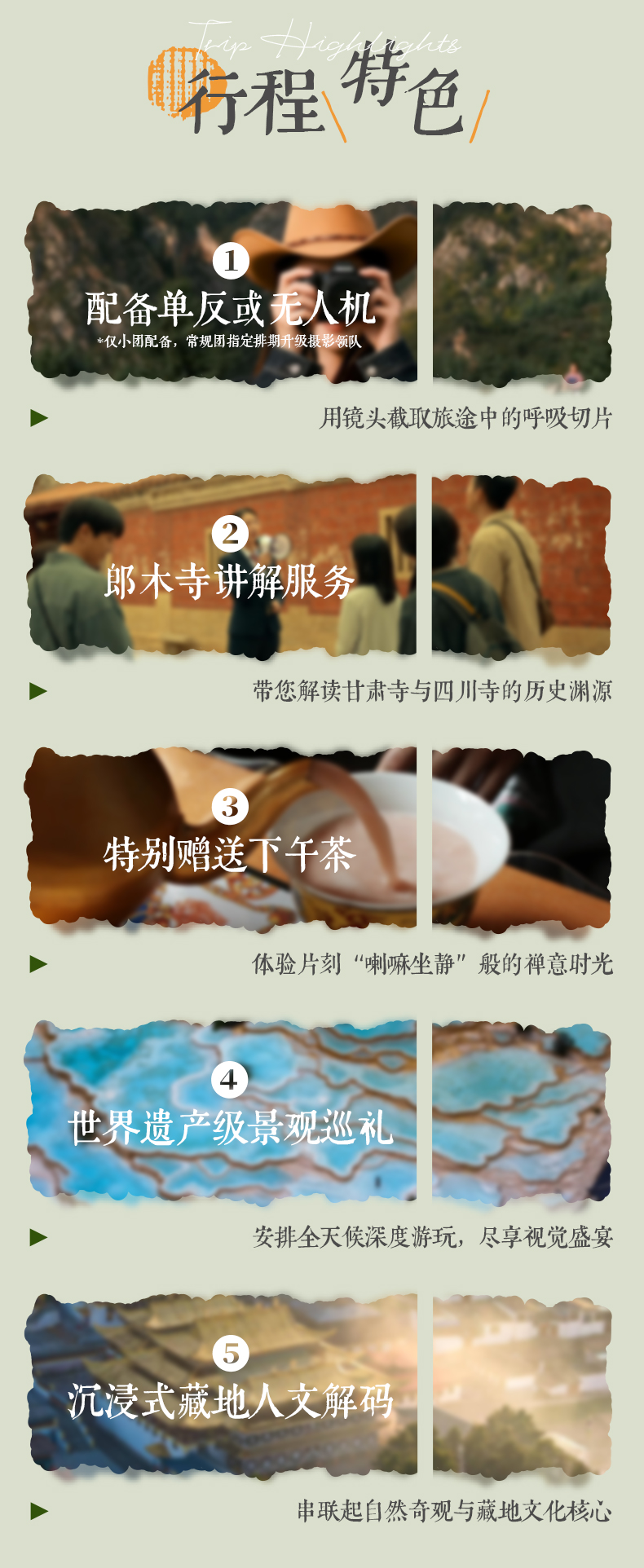 3、门票:各莫寺、莲宝叶则、九曲黄河第一湾、花湖、郎木寺、扎尕那、九寨沟、黄龙、纳摩大峡谷、景区的首道大门票。