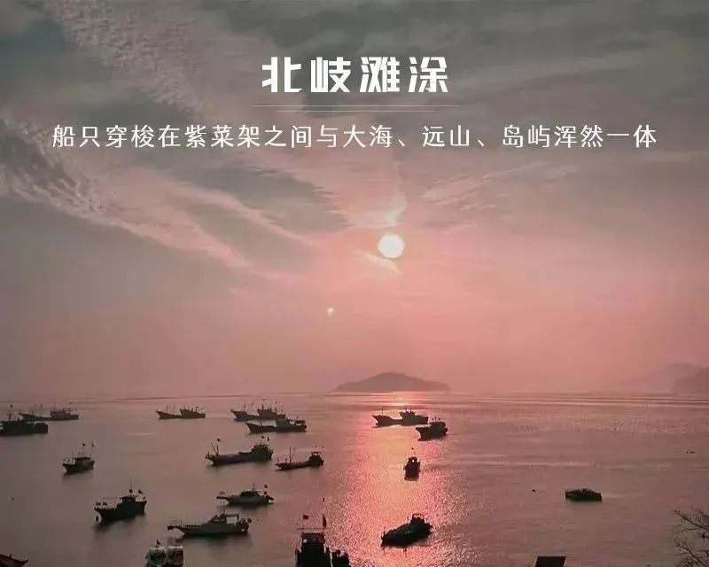 - 清晨 想看日出的朋友,自由结伴打车前往北岐滩涂拍摄海上日出,朝霞映照下的滩涂风光及渔民劳作场景,北歧是福建霞浦著名的日出点,吸引着大量的摄影爱好者,有名的是虎皮样的滩涂斑纹和满滩满海的竿影、人影和船影。涨潮时海上忙碌的船只、波光粼粼的大海和远处山影岛屿浑然一体,蔚为壮观。退潮时,海滩的纹理渐显秀质,劳作的渔民游动在虎皮滩上,使得镇滩涂更具有韵律美和动态美。