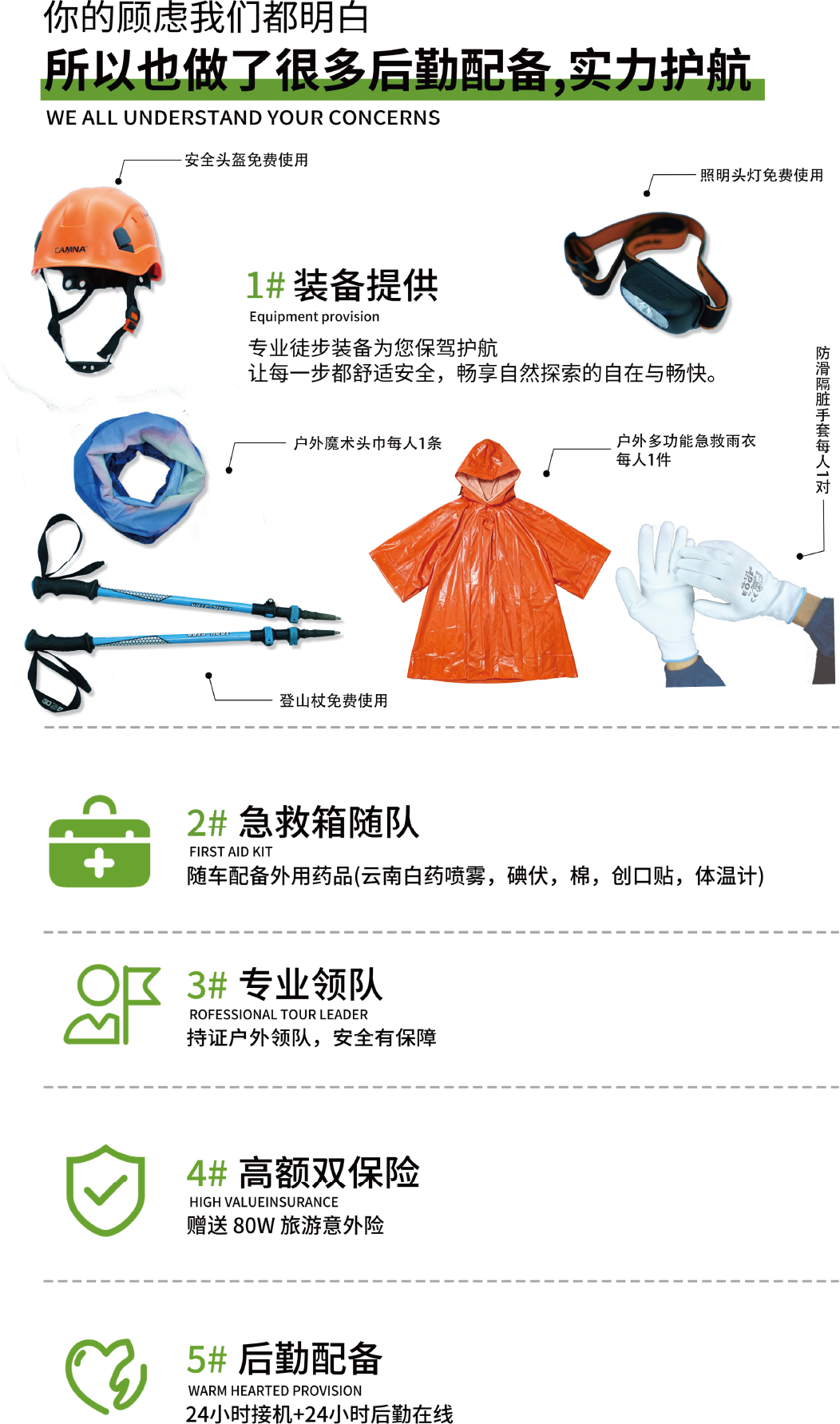 4.活动提供装备中说明的:头盔/头灯/登山杖各一件免费租借(用后回收,如需要双杖请提前告知),赠送一次性雨衣/头巾/手套(不回收)