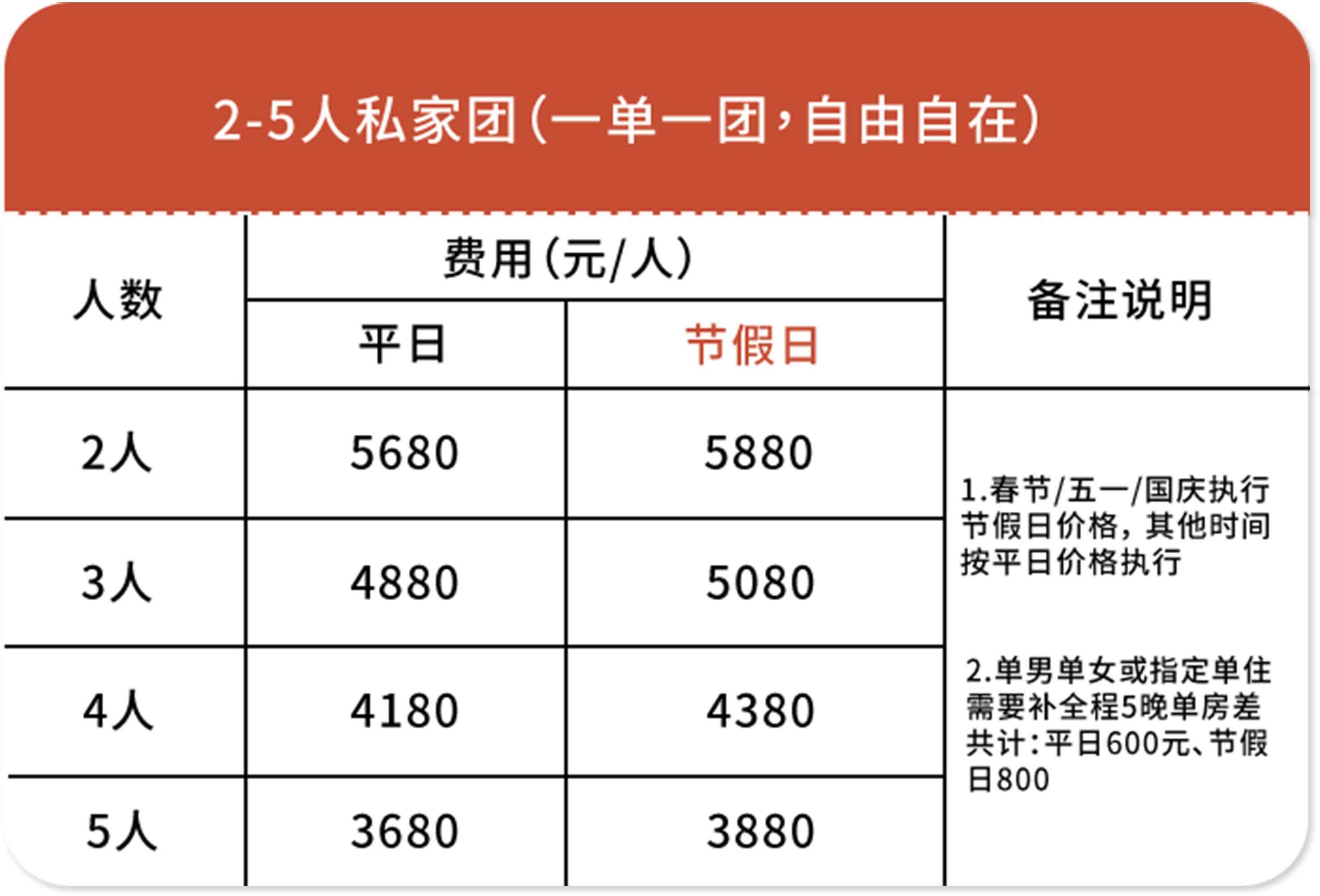 ➂ 单房差:单人报名默认同性拼房(拼房不成功无需另付单房差);指定单住或1成人带1儿童(需补全程5晚单房差价共计:平日600元/春节.五一.暑假.国庆800元)2人一起报名默认住1间房(如需分开住请主动说明)